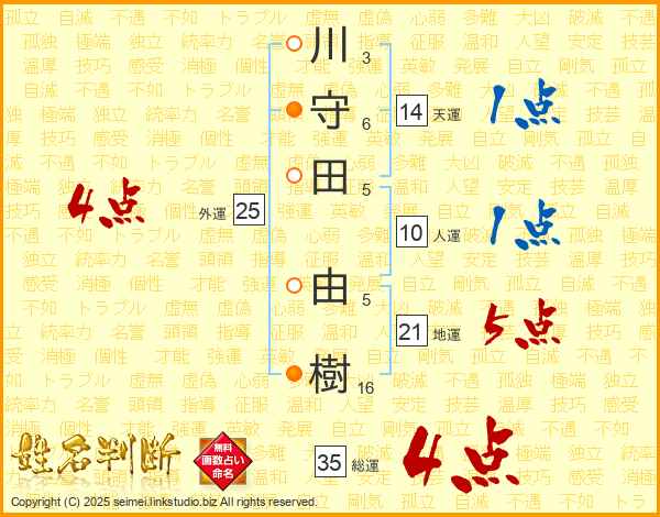 川(3画)守(6画)田(5画) 由(5画)樹(16画)