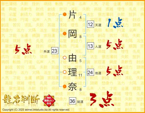 片(4画)岡(8画) 由(5画)理(11画)奈(8画)