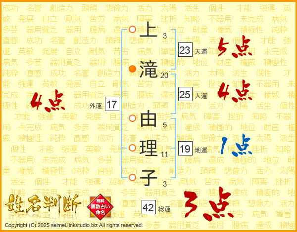 生活面を象徴する運勢です。外部から受ける影響力を表し、結婚運、家庭運や職場、環境への順応性を表します。総運から人運を引いた画数。姓や名が1文字の場合を除く。