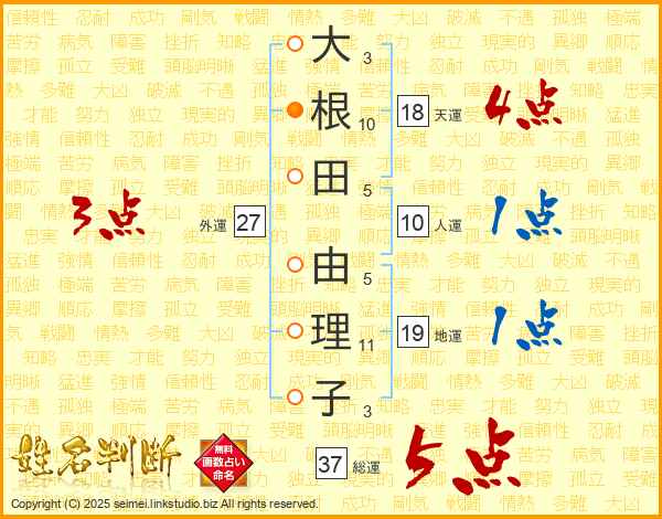 大(3画)根(10画)田(5画) 由(5画)理(11画)子(3画)