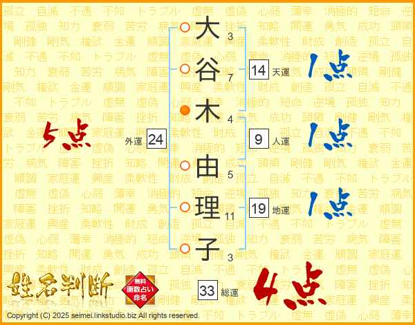 大(3画)谷(7画)木(4画) 由(5画)理(11画)子(3画)