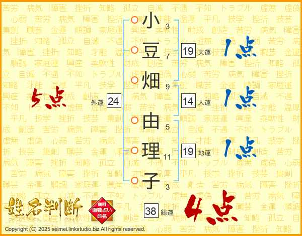 小(3画)豆(7画)畑(9画) 由(5画)理(11画)子(3画)