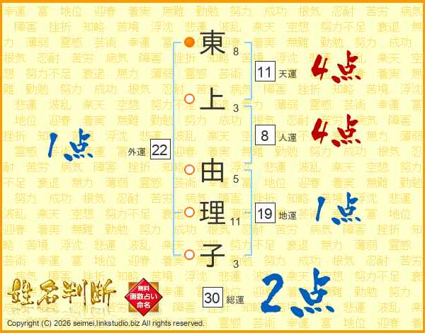 東(8画)上(3画) 由(5画)理(11画)子(3画)
