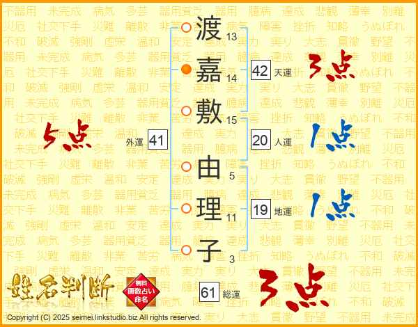 渡(13画)嘉(14画)敷(15画) 由(5画)理(11画)子(3画)
