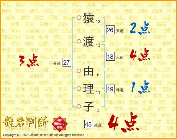 猿(13画)渡(13画) 由(5画)理(11画)子(3画)