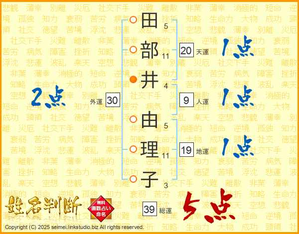 田(5画)部(11画)井(4画) 由(5画)理(11画)子(3画)