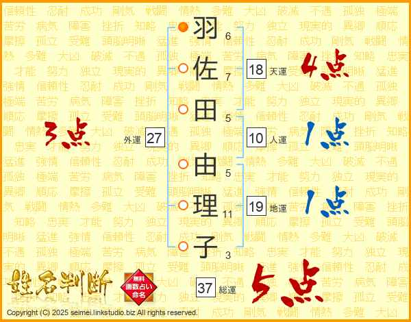 羽(6画)佐(7画)田(5画) 由(5画)理(11画)子(3画)