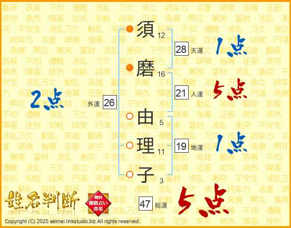 須(12画)磨(16画) 由(5画)理(11画)子(3画)