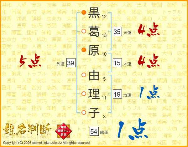 黒(12画)葛(13画)原(10画) 由(5画)理(11画)子(3画)