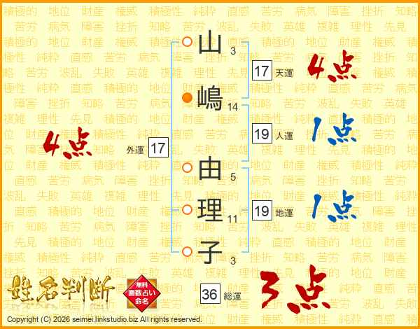 山(3画)嶋(14画) 由(5画)理(11画)子(3画)