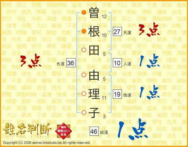 曽(12画)根(10画)田(5画) 由(5画)理(11画)子(3画)