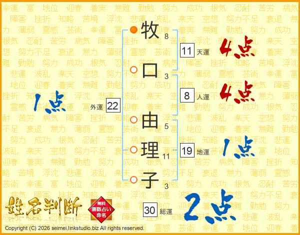 牧(8画)口(3画) 由(5画)理(11画)子(3画)