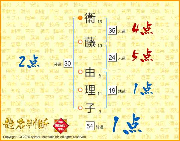 衞(16画)藤(19画) 由(5画)理(11画)子(3画)