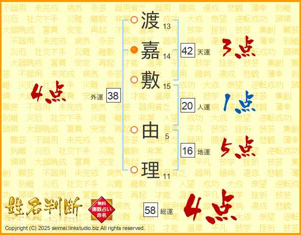 渡(13画)嘉(14画)敷(15画) 由(5画)理(11画)