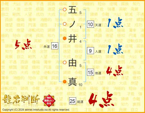 五ノ井由真さんの総運は25画の4点!