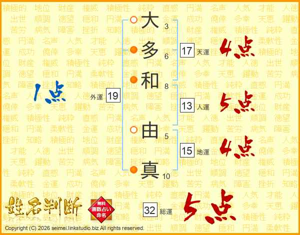 生活面を象徴する運勢です。外部から受ける影響力を表し、結婚運、家庭運や職場、環境への順応性を表します。総運から人運を引いた画数。姓や名が1文字の場合を除く。