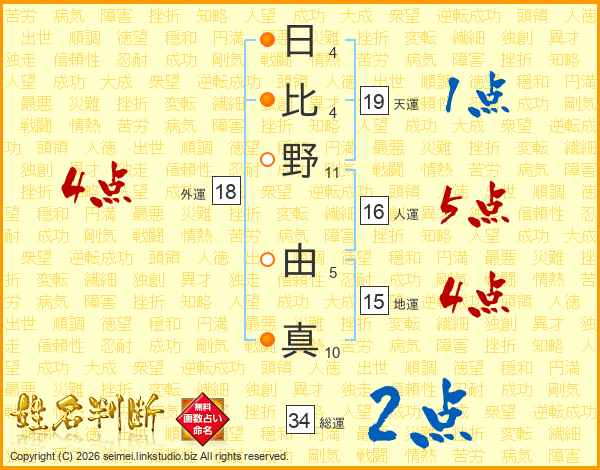 日(4画)比(4画)野(11画) 由(5画)真(10画)
