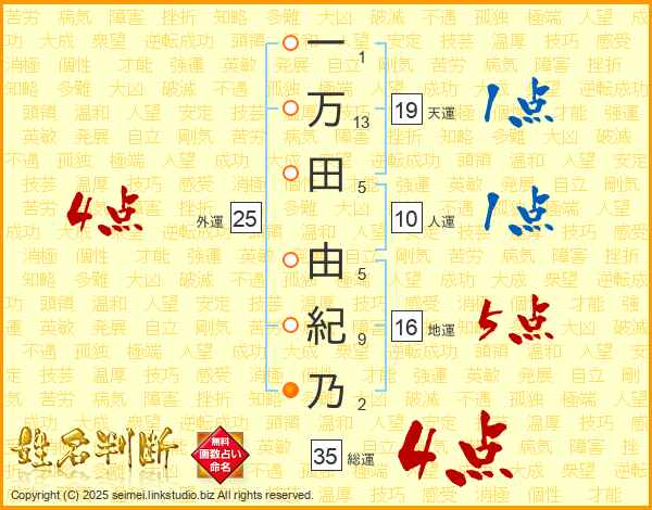 一(1画)万(13画)田(5画) 由(5画)紀(9画)乃(2画)