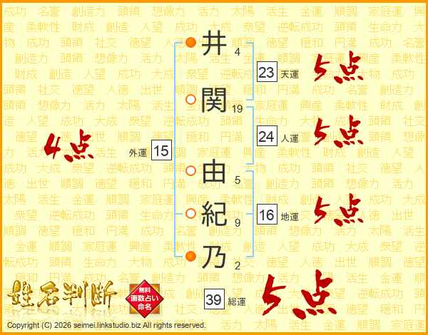 井(4画)関(19画) 由(5画)紀(9画)乃(2画)