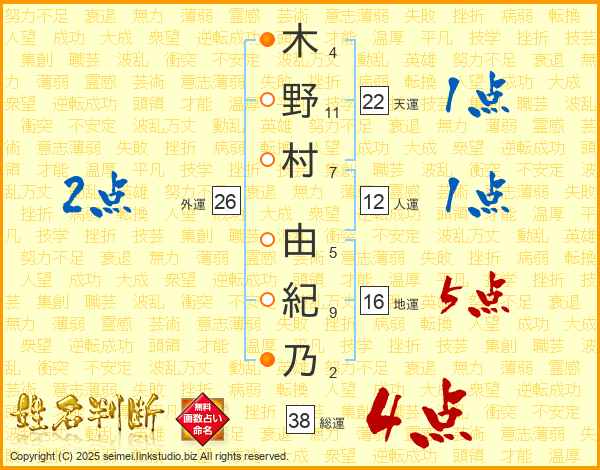 木(4画)野(11画)村(7画) 由(5画)紀(9画)乃(2画)