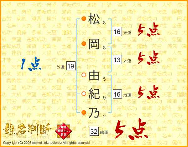 松(8画)岡(8画) 由(5画)紀(9画)乃(2画)