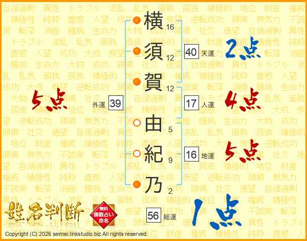 横(16画)須(12画)賀(12画) 由(5画)紀(9画)乃(2画)