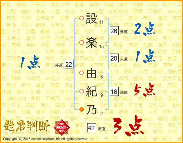 設(11画)楽(15画) 由(5画)紀(9画)乃(2画)