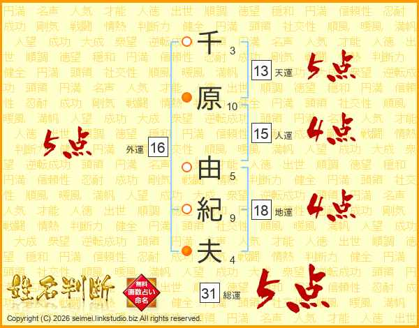 千原由紀夫さんの総運は31画の5点!