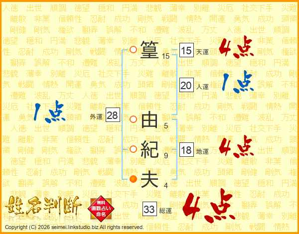 篁(15画) 由(5画)紀(9画)夫(4画)