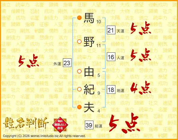 馬(10画)野(11画) 由(5画)紀(9画)夫(4画)