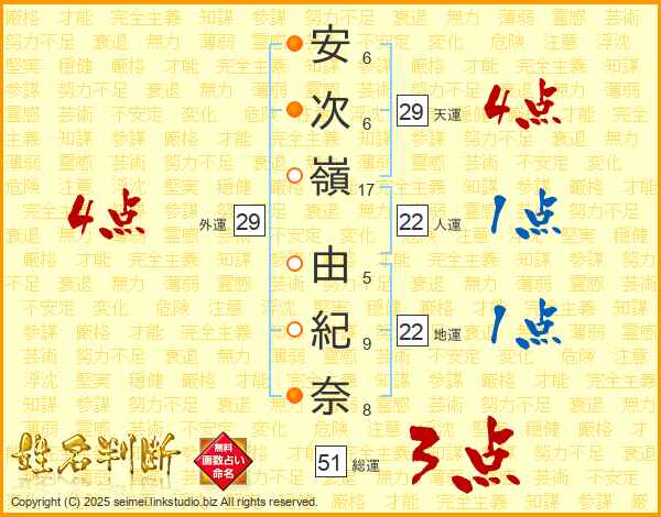 安(6画)次(6画)嶺(17画) 由(5画)紀(9画)奈(8画)