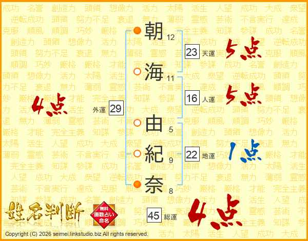 朝(12画)海(11画) 由(5画)紀(9画)奈(8画)