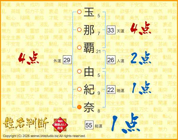 玉(5画)那(7画)覇(21画) 由(5画)紀(9画)奈(8画)
