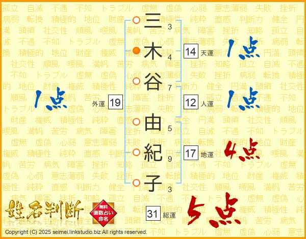 三(3画)木(4画)谷(7画) 由(5画)紀(9画)子(3画)