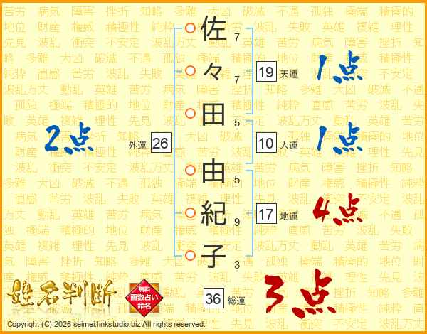 佐(7画)々(7画)田(5画) 由(5画)紀(9画)子(3画)