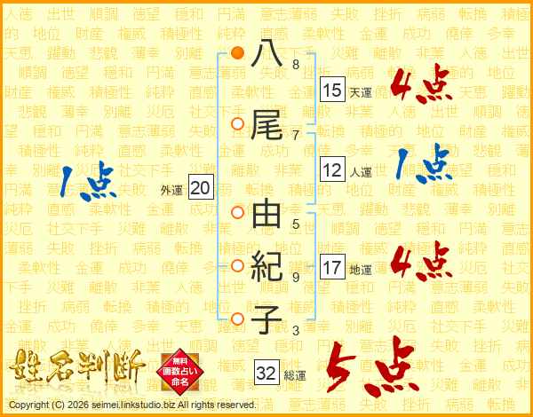 八(8画)尾(7画) 由(5画)紀(9画)子(3画)