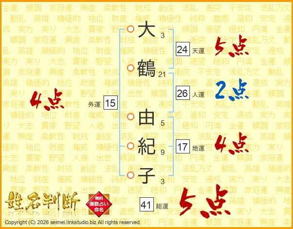 大鶴由紀子さんの総運は41画の5点!