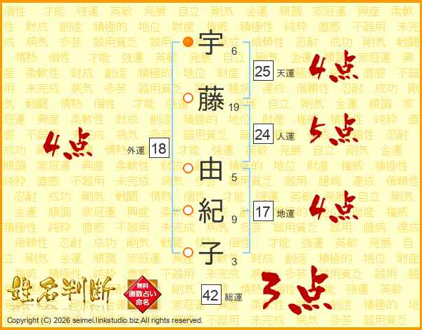 宇(6画)藤(19画) 由(5画)紀(9画)子(3画)