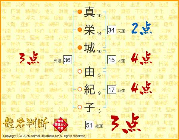 真(10画)栄(14画)城(10画) 由(5画)紀(9画)子(3画)