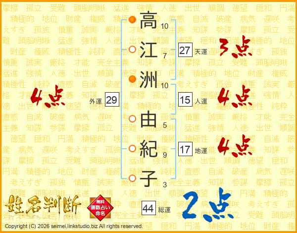 高(10画)江(7画)洲(10画) 由(5画)紀(9画)子(3画)