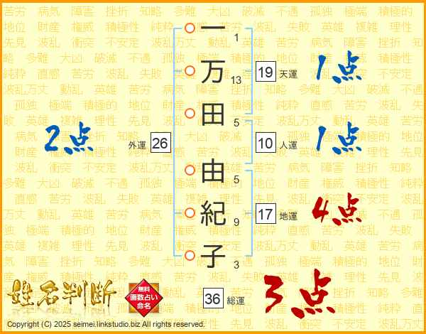 一(1画)万(13画)田(5画)  由(5画)紀(9画)子(3画)