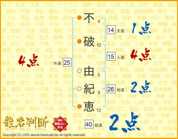 不(4画)破(10画) 由(5画)紀(9画)恵(12画)