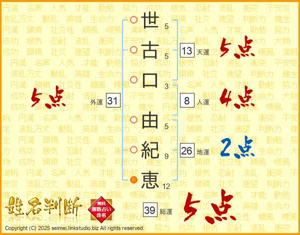 世(5画)古(5画)口(3画) 由(5画)紀(9画)恵(12画)