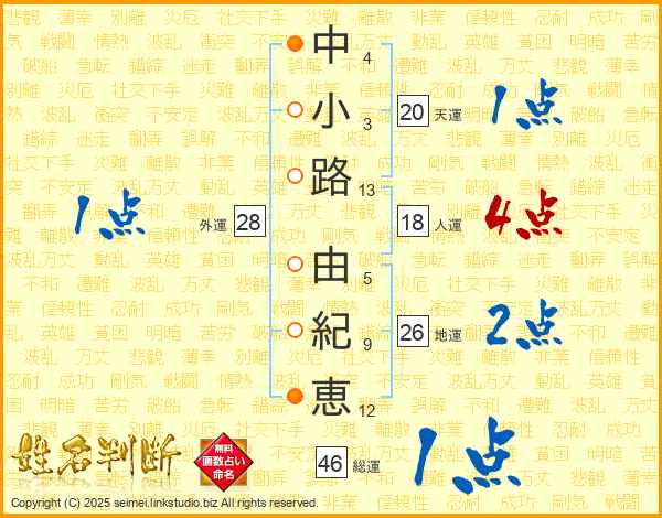 中(4画)小(3画)路(13画) 由(5画)紀(9画)恵(12画)