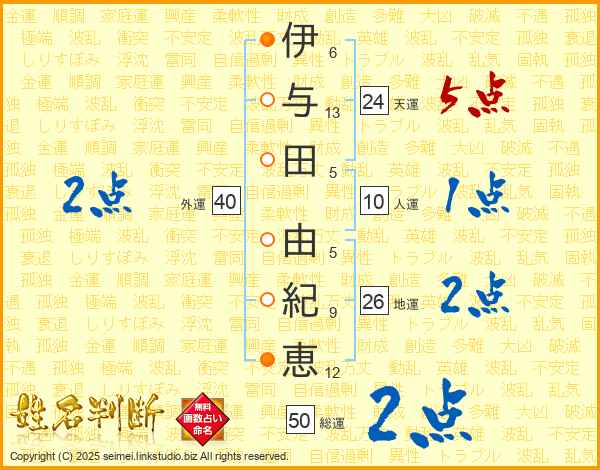 伊(6画)与(13画)田(5画) 由(5画)紀(9画)恵(12画)