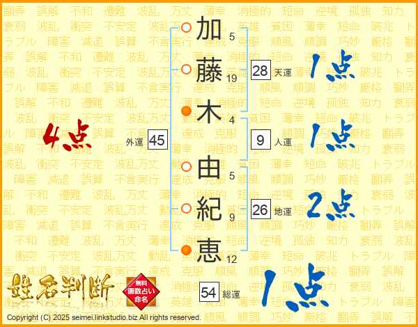 加(5画)藤(19画)木(4画) 由(5画)紀(9画)恵(12画)