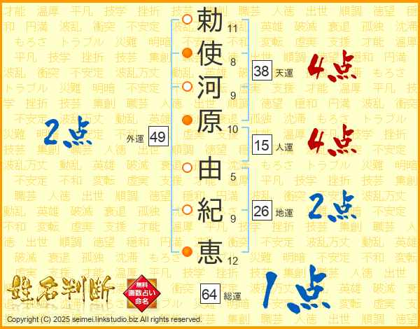 勅(11画)使(8画)河(9画)原(10画) 由(5画)紀(9画)恵(12画)