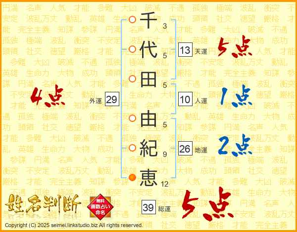 千(3画)代(5画)田(5画) 由(5画)紀(9画)恵(12画)