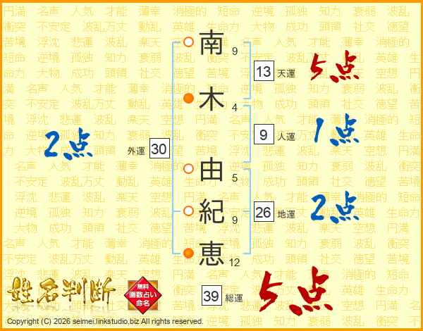 南(9画)木(4画) 由(5画)紀(9画)恵(12画)