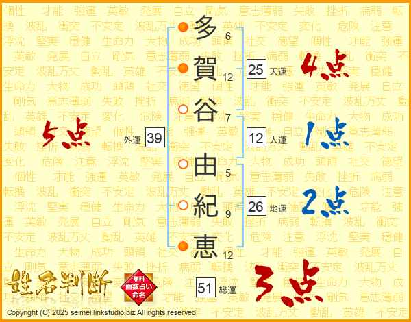 多(6画)賀(12画)谷(7画) 由(5画)紀(9画)恵(12画)